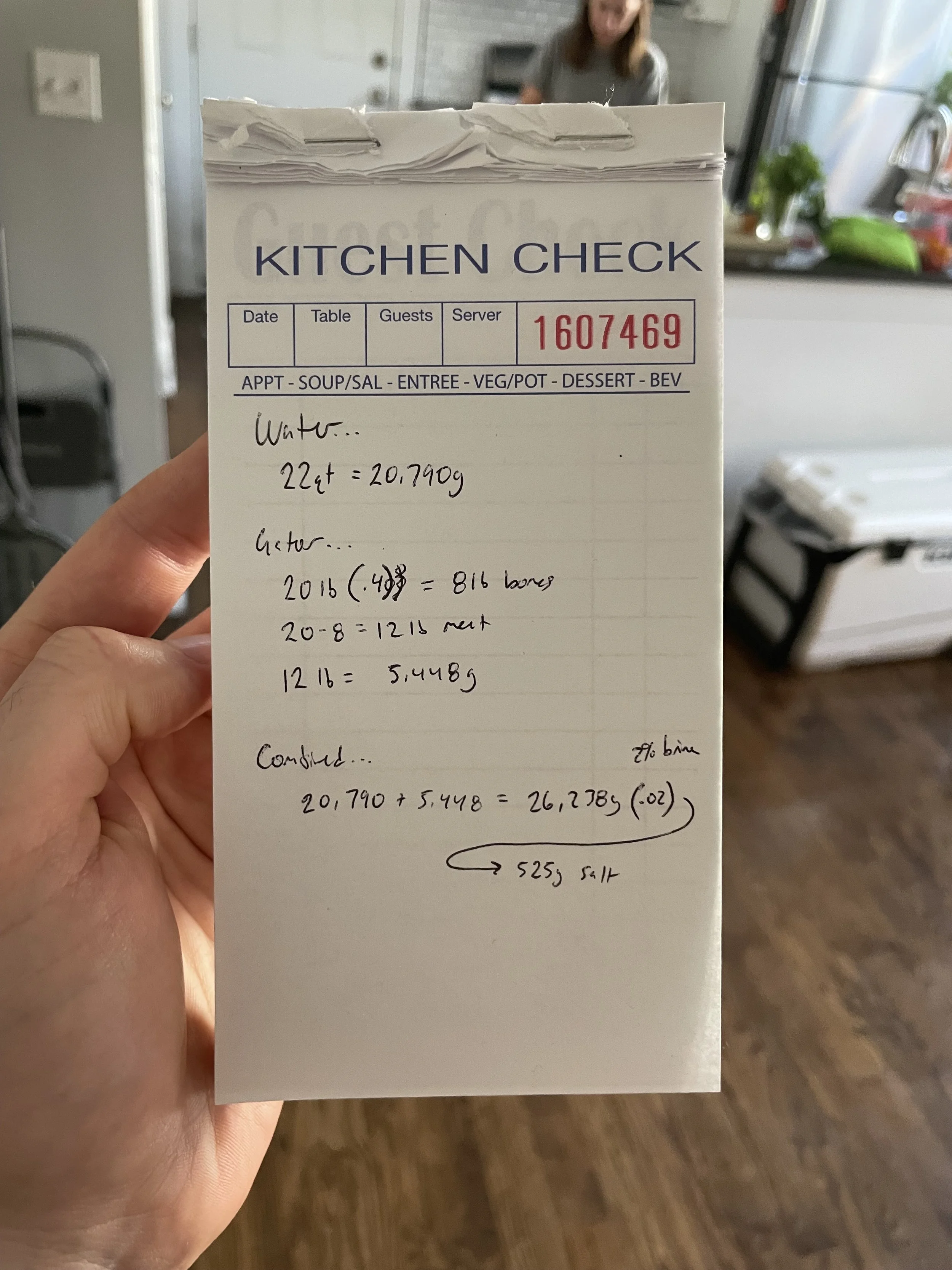 First measure the weight of the animal in grams then subtract 20% of that weight to account for the bones. Bone cannot be penetrated by brine, therefore, we must account for it then remove it from our calculation. 20% is a solid general number that I use when brining chicken and, in this case, alligator. Add the meat weight and water weight together in grams, then multiply that number by (.02) to get 2%. That 2% number is how much salt that you need to weigh then add to the water in grams.