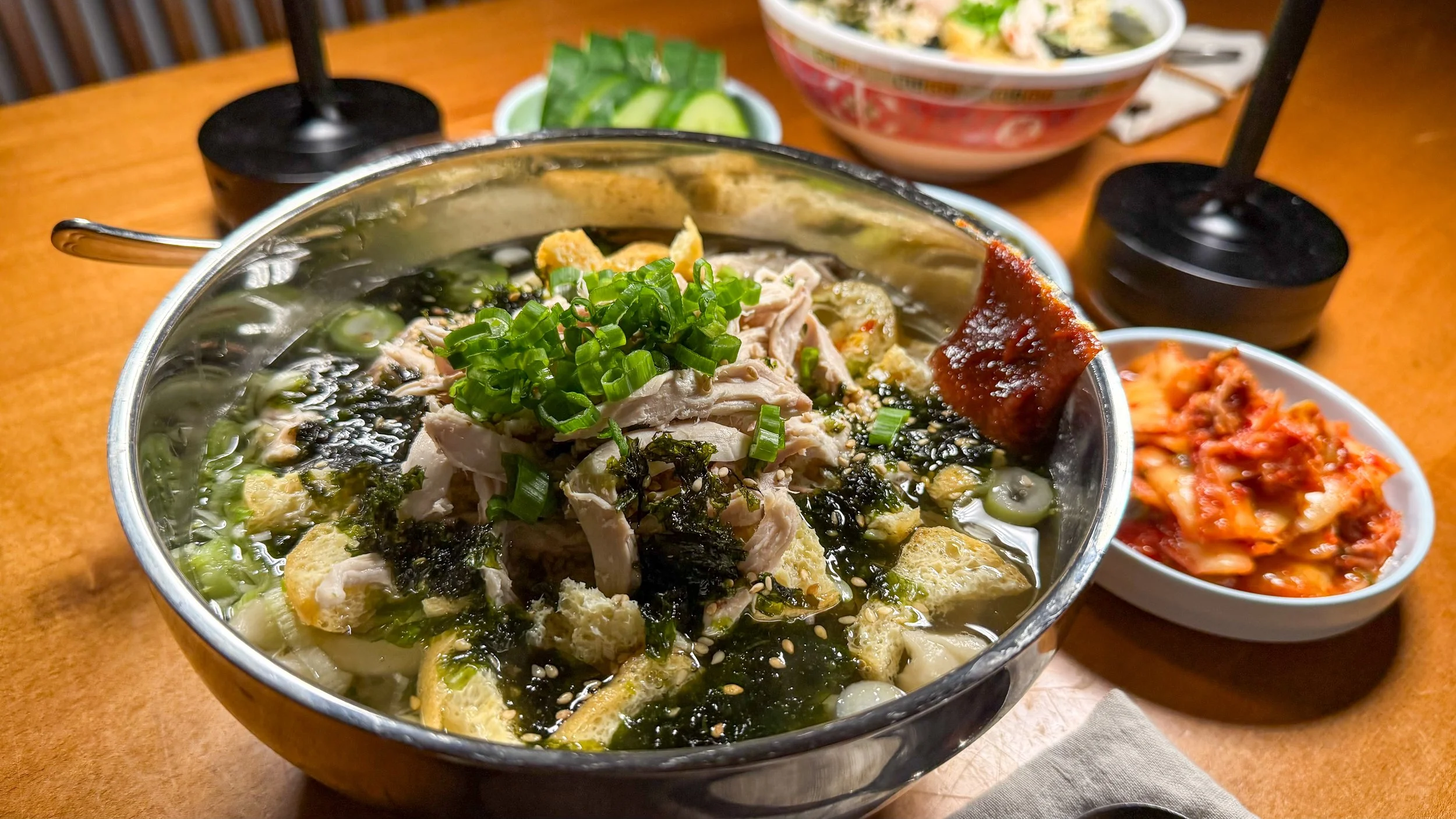 - Garnish with coined Tokyo negi whites (daepa), sliced scallions, fried tofu, shredded chicken, sliced gim, toasted sesame seeds, and a light drizzle of sesame oil. Smear a spoonful of gochujang on the side of the bowl and munch with a side of your favorite kimchi.