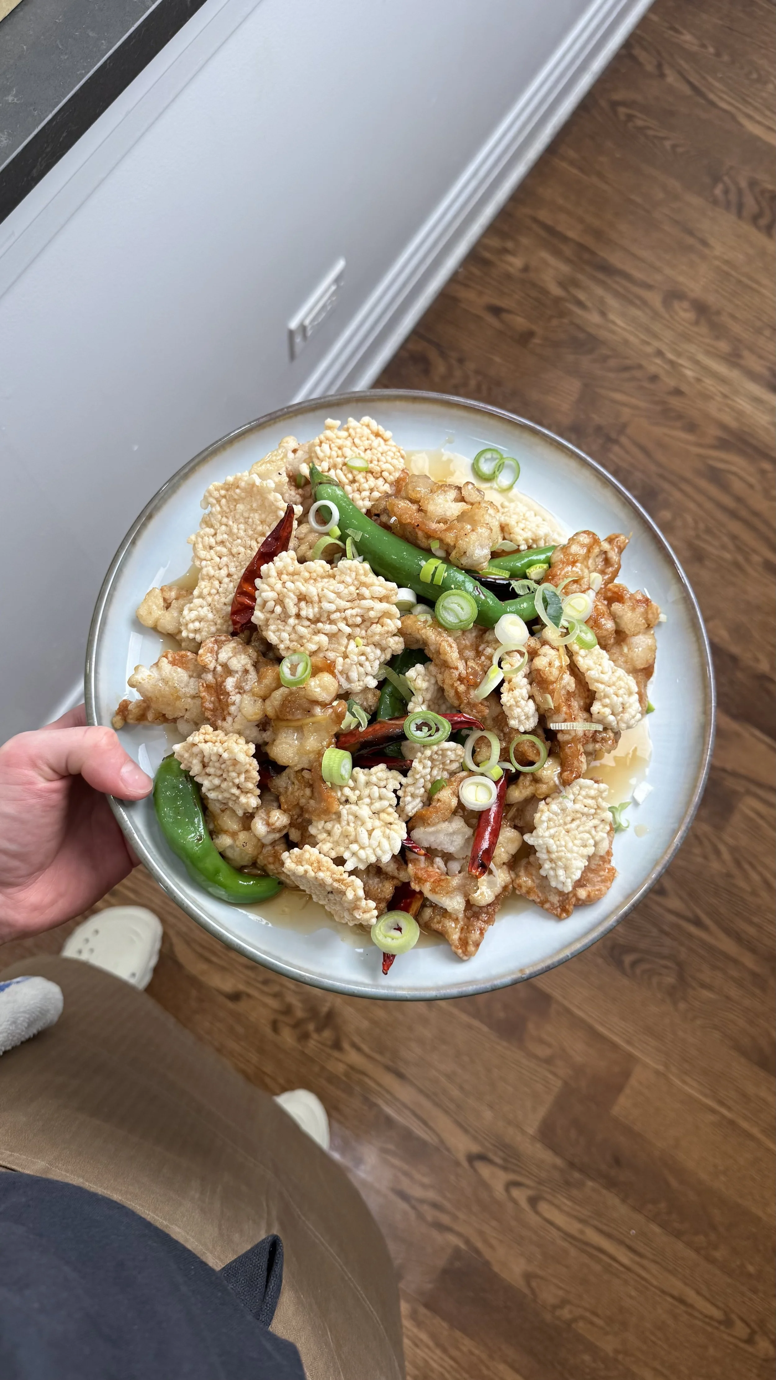 - In a hot wok or pan, stir fry the fried pork with green pepper and dried red chili briefly — just enough to get some color and heat on the vegetables.