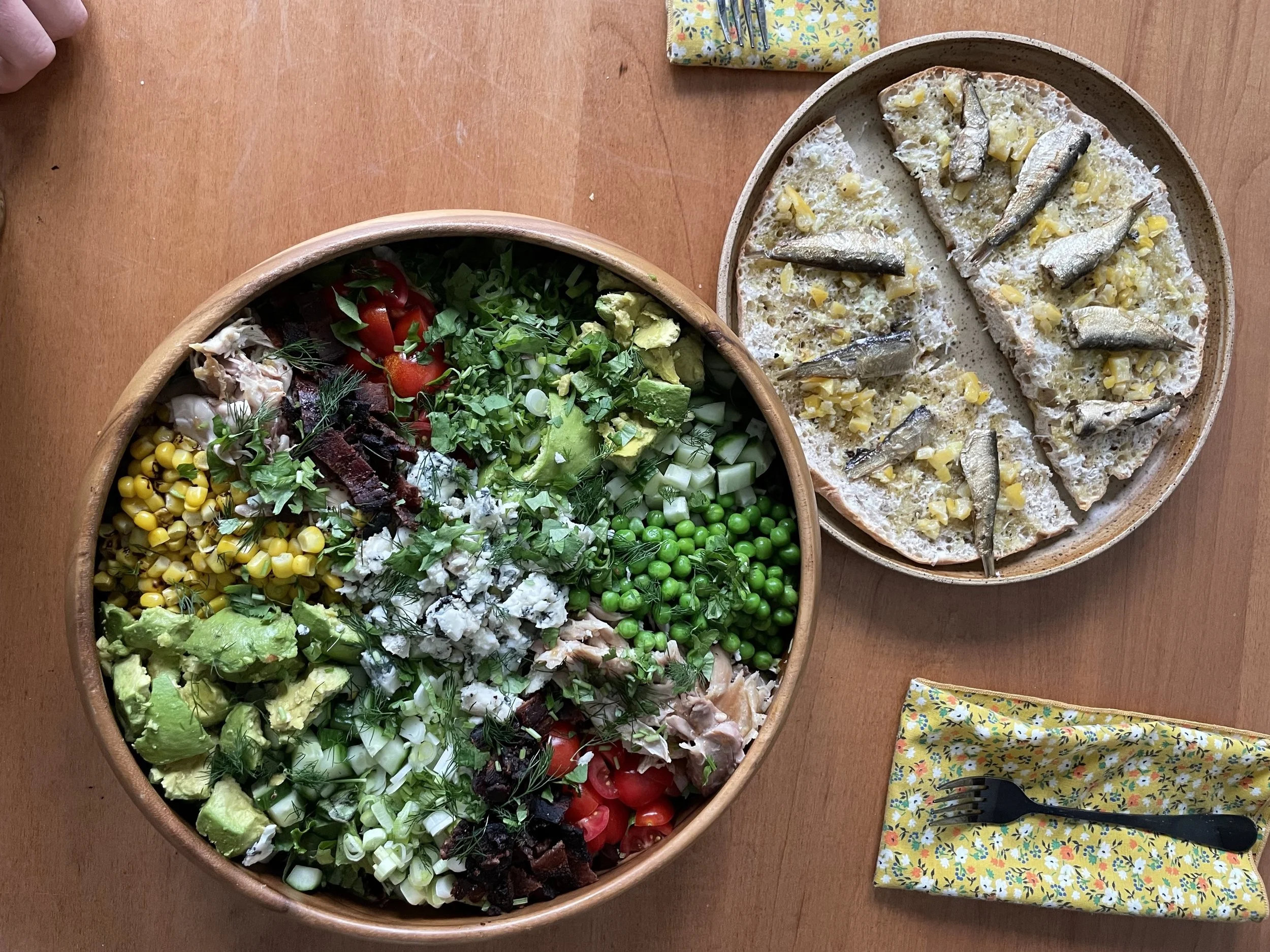 - Add the mixed greens, dill and cilantro to a large serving bowl and toss to combine. In sectioned areas, atop the herby greens, place the cucumber, avocado, cherry tomatoes, scallions, blue cheese, bacon, thawed peas, thawed corn, and pulled chicken. Top with crunchy tortillas strips. Top the cold/raw veggies with a tiny pinch of salt each.