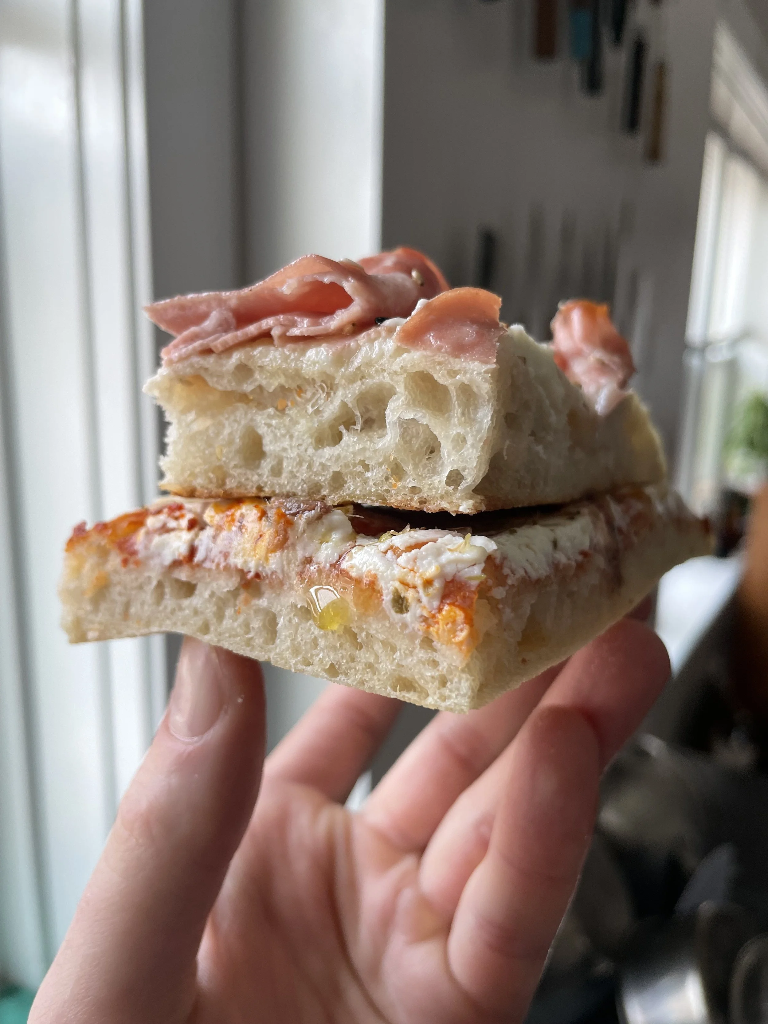 Notice how the piece on the top is taller and more “open crumbed” than the bottom. That’s because it was par-baked without any sauce. If you add sauce or toppings to the pizza before par-baking, it will weigh down the dough and it will not have as much rise. The lesser rise is not necessarily “bad form,” it just depends what you’re going for. There isn’t a wrong way to make this style, which is the beauty of it.