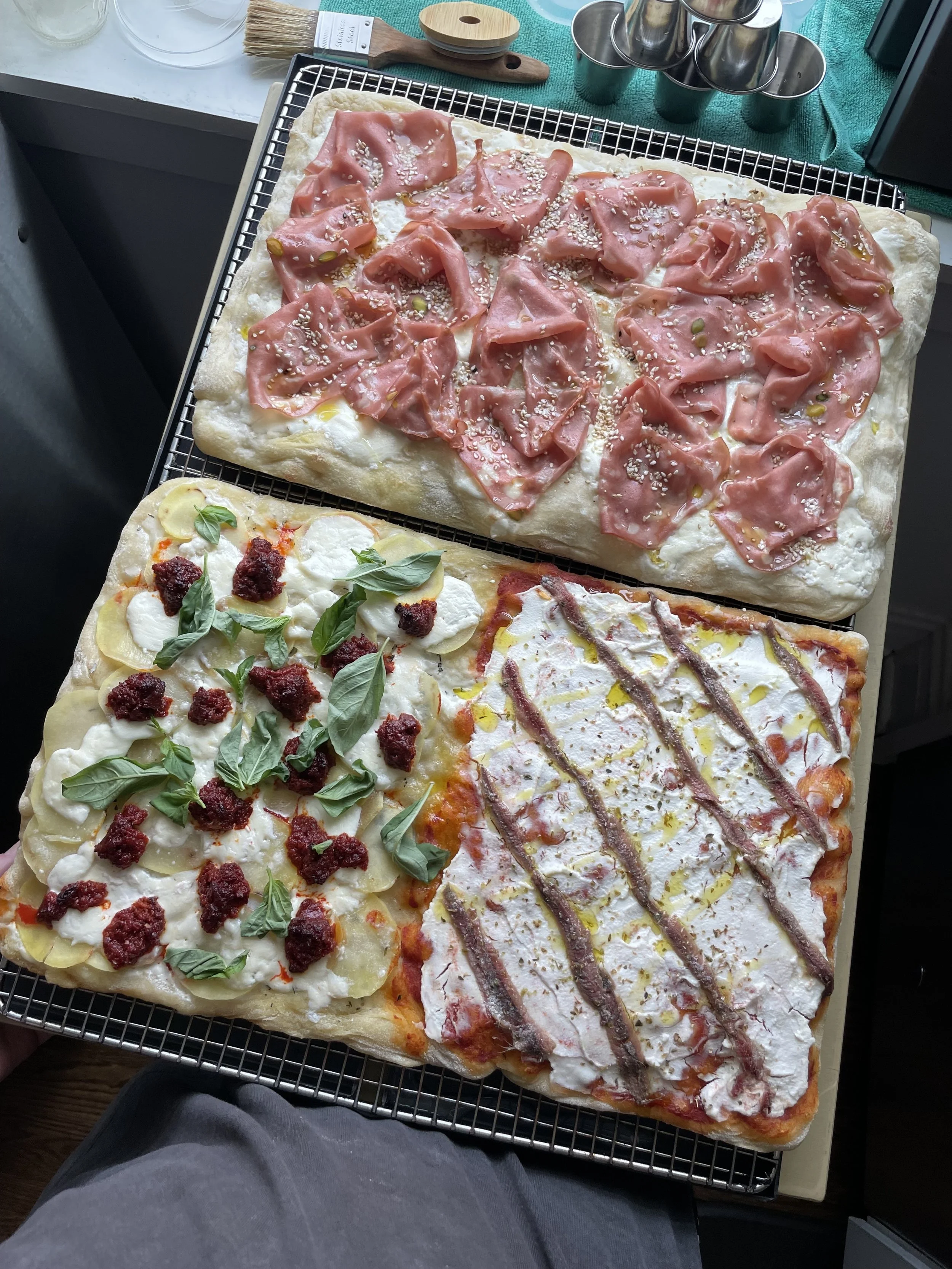 - 1 hour before baking, preheat the oven to 500F with the pizza steel on the middle rack of the oven.