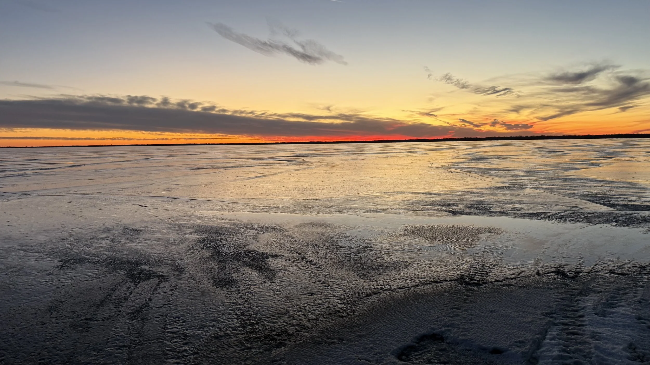 The sunset over Lake Michigan in Green Bay after 12 hours on the ice.