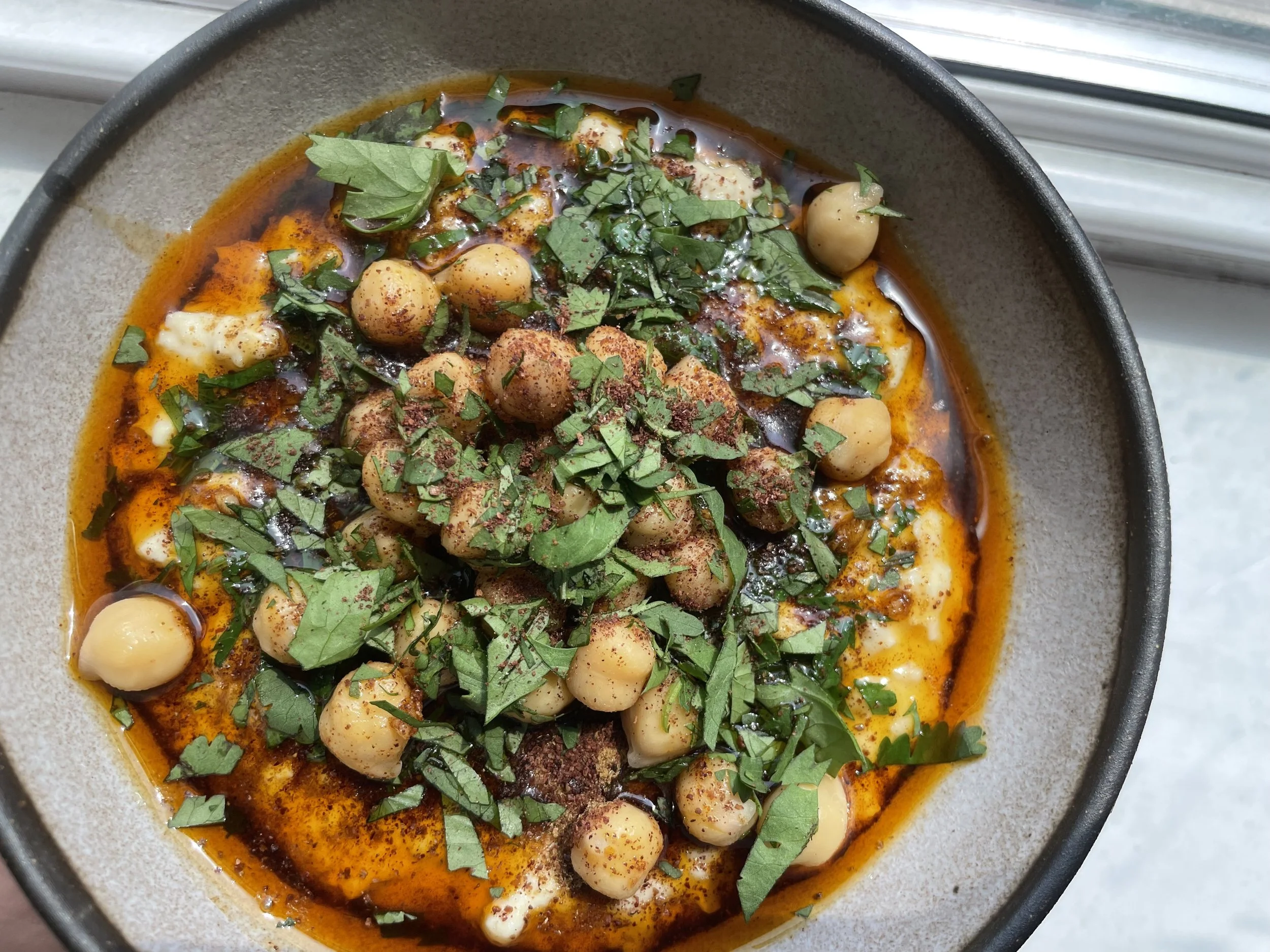 - Top with pinch of Sumac, ground cumin, chopped cilantro, top with fresh chickpeas.