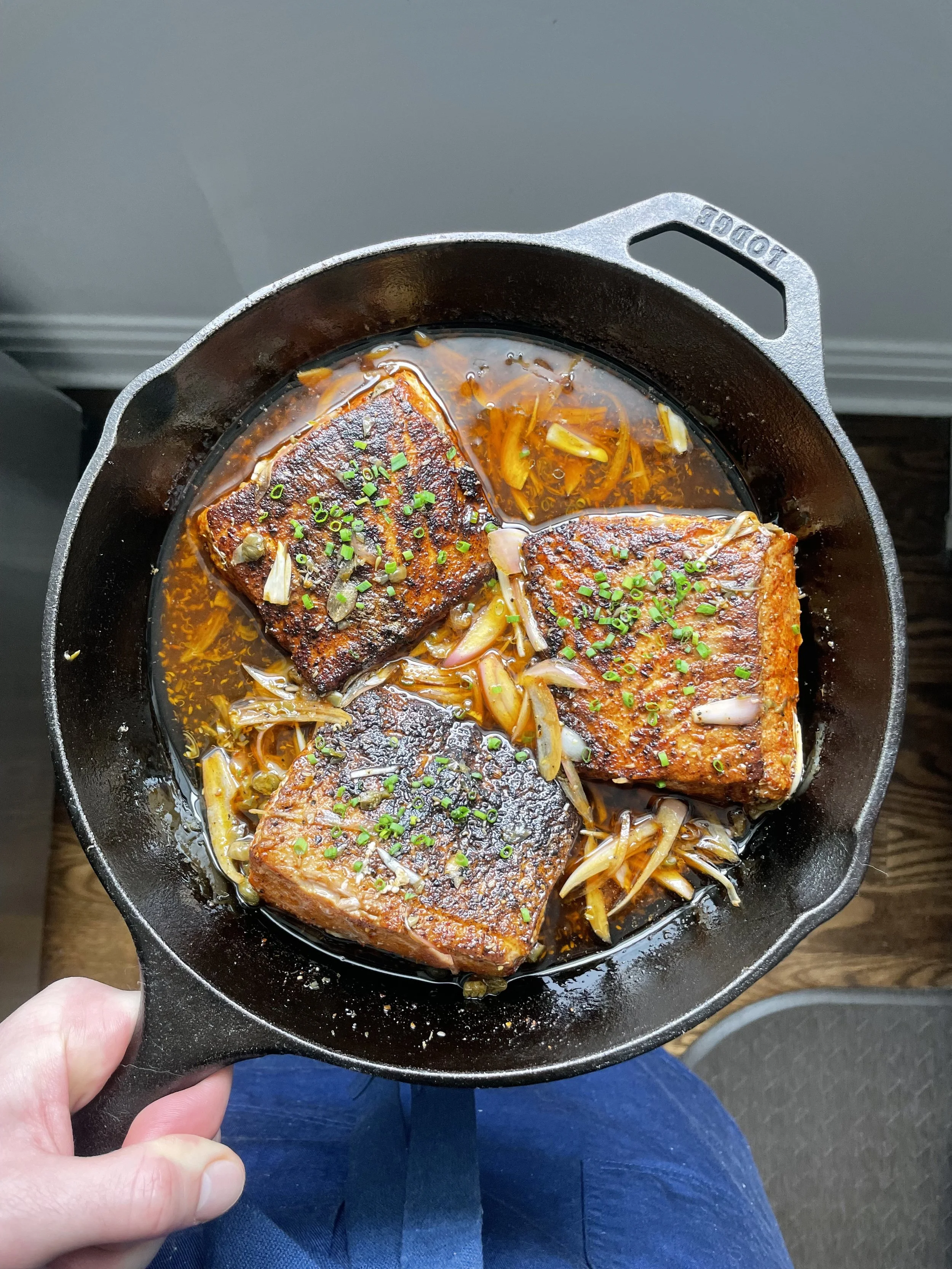 When the wait is over, the marinated salmon escabeche emerges in all its glory. Its flavors are complex yet harmonious – a tapestry of the ocean's briny essence, the marinade's zing, and the salmon's rich fattiness. The meat, delicate yet firm, carries the tang of the marinade intertwined with its own distinctive taste, a melding of traditions and flavors. It is a celebration of the humble salmon's transformation through the magic of escabeche, a dish that sings of sunny Spanish coasts and languid seaside lunches. This, my friends, is more than a meal; it's a voyage. 🤘🏼 Adam